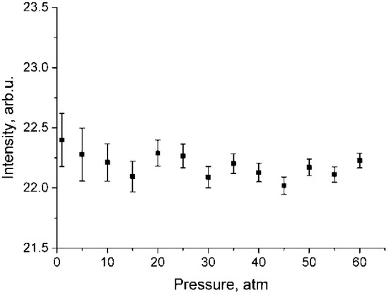 According to the data shown in Figure 4, both a decrease in intensity in the polarized spectrum and an increase in intensity in the depolarized spectrum are observed. This results from lower methane molecule symmetry at high pressure [21,22]. To verify the fact that the increase in the intensity in Figure 4b is not due to the features of the experiment, Figure 5 shows the dependence of the integrated intensity of the depolarized spectrum of the ν3 band in the range of 2820–2870 cm−1 where there are no ν1 lines. Referring to this figure, the intensities after normalization per unit of density is stable. Thus, the data presented in Figure 4b are correct. Note that, as shown in Figure 4, the increase in intensity in the depolarized spectrum is less than its decrease in the polarized one. Taking into account that the intensity ratio of the 2ν4/ν1 and 2ν2/ν1 increases with increasing pressure [13], it can be assumed that the decrease in the ν1 intensity in the polarized spectrum is caused not only by intensity redistribution to the depolarized spectrum, but also to 2ν4 and 2ν2 overtones by means of Fermi resonance [24].