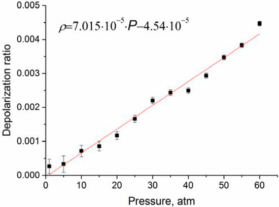 The error bars shown in Figure 2 were calculated as follows. We believe that in our case, the main source of the error in measuring ρ is the signal fluctuations caused by shot noise and detector noise. To determine these fluctuations, we have additionally recorded five methane Raman spectra at pressures of 1 and 60 atm. From the spectra obtained, standard deviations were estimated of the integral intensities δP in the specified spectral ranges for these pressures. For other pressure values, δP were estimated by interpolating these data. The errors in measuring the depolarization ratio at each P (∆P) were estimated using Equation (1)