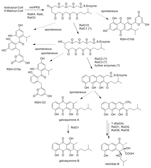 Proposed early steps in the biosynthetic pathway of rishirilide B. RSH-O10a, RSH-O10b. RSH-O3 and galvaquinones A and B are shunt products derived from an unstable polyketo-chain.