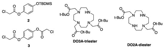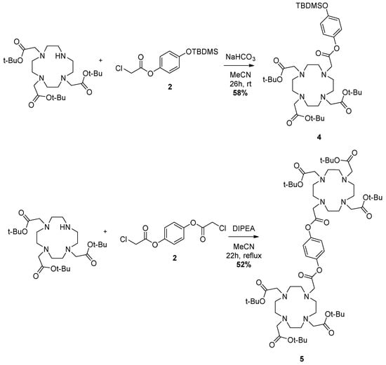 3.2.4. Synthesis of Tri-tert-butyl 2,2′,2′′-(10-(2-(4-((tert-butyldimethylsilyl)oxy)phenoxy)-2-oxoethyl)-1,4,7,10-tetraazacyclododecane-1,4,7-triyl)triacetate (4)