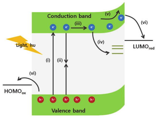 The excited charge carriers are generated by incident light, transfer and separate into the electron/hole acceptors at the surface of an electrode (Figure 1). Once the excitons are generated by the light absorption (Figure 1 (i)), the photogenerated carriers transfer toward the surface of the material according to the charge carrier concentration gradients and/or the applied bias (Figure 1 (ii)). However, if the charge carriers cannot transfer rapidly due to intrinsic electrical conductivity limitations of the materials, the excitons relax to the ground state and generate heat or light (Figure 1(iii)). Additionally, charge carriers can be trapped in trap states, such as antisites, interstitials, and vacancy defects (Figure 1 (iv)) [5,6,7,8,9]. The surface contains a high density of vacancy defects because the bulk crystalline structure does not elongate further. The disconnectivity of the crystalline structure generates various dangling bonds and creates unpaired electrons, surface dipoles, and trap states, which are located away from the minimum conduction and maximum valence band edges. Surface defects affect the Fermi level at the surface of the materials and change the concentration of the charge accumulated at the surface. Besides, the generated charge carriers are trapped at these defect states on the surface. This phenomenon reduces the concentration of available charge carriers, which are consumed in catalytic reactions on the surface, and decreases the energy conversion efficiency.