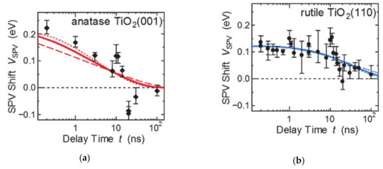 The surface structure in accordance to the crystalline facets, which have the ordered atomic arrangements and distinctive coordination states have characteristic electronic and chemical properties. These atomic arrangements also change the charge carrier accumulation and chemical potential at the surface. Considering a single crystal, the anisotropic charge transfer depending on the surface facets were presented because of the Fermi level and band bending [43]. For example, the anatase TiO2 crystalline structure presented the facet-sensitive Fermi level between the (001) and (101) facets, as observed by X-ray photoelectron spectroscopy and ultraviolet photoelectron spectroscopy. Fine control of surface termination by sputtering, annealing, and reoxidation confirmed that the higher densities of deep trap states such Ti3+ interstitials and oxygen vacancies were generated dominantly in (001) facets. In addition, the variation of the Fermi level of exposed facets is larger than that of the (101) facets, while the Fermi level of the (001) facets is always higher than that of the (101) facets [44]. Surface dipoles also depend on the facets, which also change the barrier height at the surface (Figure 2) [44]. The (001) facets of anatase and the (110) facets of rutile TiO2 have been analyzed with time-resolved photoelectron spectroscopy to confirm the carrier lifetime and the band bending when irradiated with light (Figure 2). The magnitude of the negative band bending is larger in anatase (001), whereas the complete charge carrier relaxation time is lower for (110) rutile TiO2. This comparison indicates that the concentration of transferred and accumulated electrons on the surface is higher in the case of (001) facets of TiO2. However, the surface defect concentration on the surface affects the barrier height. And the higher barrier height of the (110) rutile facets increases the photoexcited electron relaxation time. The exposed facets change the Fermi level, the band bending, and the barrier height at the interface and affects the charge transfer and separate process. Thus, the photo- and photoelectrocatalytic reaction is dependent on the surface exposed facets. For example, in SrTiO3, the photogenerated hole is preferred to be accumulated on the (110) facets to oxidize the adsorbed chemical species, while the (001) facets prefer electron extraction. This difference results from exposed elements on the surface inducing the surface dipoles, which leads to specific charge carrier transfer and accumulation on the surface [40,45].