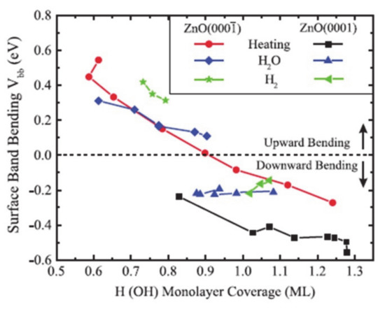 The surface termination of the ZnO changes the band bending at the surface, which is observed by the X-ray photoelectron spectroscopy. The figure is reproduced from Ref. [46] with permission from the American Physical Society.
