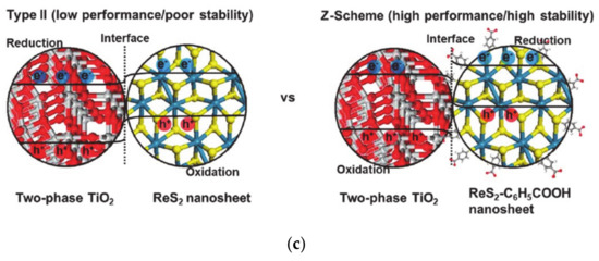 The barrier height between solid-solid interface can be modulated by the surface dipole, affecting the charge transfer mechanism. When the barrier height is small, thermionic emission charge transfer is dominant, while intraband tunneling occurs when the barrier height is large. Therefore, the characteristic charge transfer distance has a reverse-volcano relationship with the surface dipole and the barrier height [99]. Insertion of organic molecules at the solid-solid interface changes the charge transfer mechanism to Z-scheme charge transfer by band bending modulation at the interface. Normally, the electrons and holes are transferred through the interface and separated in different solid materials when the band levels of two materials are staggered (Figure 4c). However, the photo-generated holes recombine with the major carrier electrons in another material at the interface in the Z-scheme mechanism, thus photo-generated electrons accumulate in the p-type materials to reduce water for production of hydrogen molecules [100]. In addition to molecular functionalization, various interface band bending methods, including the insertion of materials such as graphene, or carbon materials can change the charge transfer pathway [103,104].