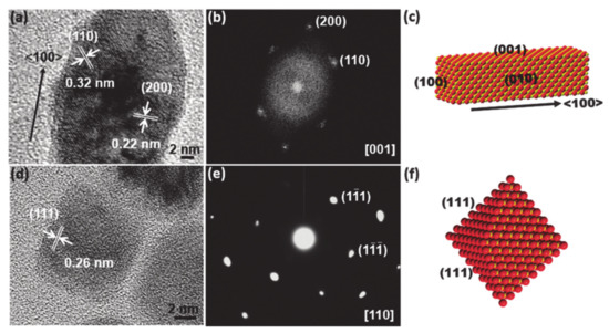 (a,b) The high-resolution transmission electron microscope (TEM) image of a single rod of MnO polypods (a) and the corresponding selected area electron diffraction (SAED) pattern (b). (c) Schematic illustration indicating the growth direction and exposed planes of MnO nanorods on MnO polypods. (d,e) The high-resolution TEM image of a single MnO octahedral nanoparticle (NP) (d) and the corresponding SAED pattern (e). (f) Schematic illustration indicating the growth direction of MnO octahedral NPs. O is red and Mn is yellow. Reproduced with permission [125]. Copyright 2015, Royal Society of Chemistry.