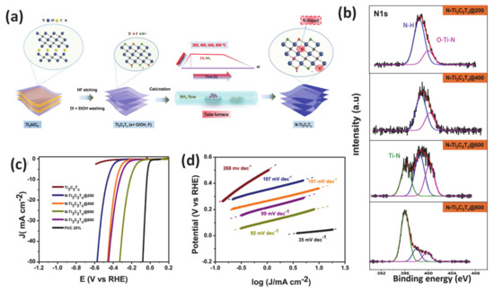 (a) Illustration of synthesis of nitrogen-doped MXene (N-Ti3C2Tx) from the Ti3AlC2 MAX Phase, (b) core-level X-ray photoelectron spectroscopy (XPS) of the N 1s of N-doped MXene samples annealed at various temperatures, (c) HER polarization curves of various obtained-electrocatalysts, (d) corresponding Tafel plots. Reproduced with permission [137]. Copyright 2019, American Chemical Society.