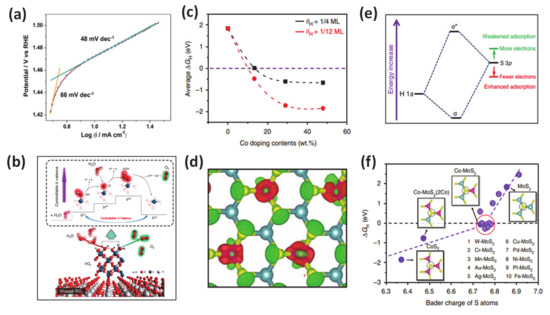 (a) Oxygen evolution reactions (OER) activity: Tafel plot of the IrOx-TiO2-Ti (ITOT) catalyst at the scan speed of 10 mV/s. (b) Proposed OER mechanism of ITOT catalyst. Theoretical calculations for the effect of Co doping contents on HER of MoS2. Reproduced with permission [134]. Copyright, 2019, American Chemical Society. (c) Average hydrogen adsorption free energy ∆GH on S atoms versus the Co doping contents, considering different coverage of 1/4 monolayer (ML) and 1/12 ML. (e) Schematic diagram of the bonding of H 1s orbital and S 3p orbital (from MoS2), where depletion of electrons on S atoms will lower the orbital position and enhance the H-S bond. (d) The differential charge density of Co-doped MoS2 (Co doping content of 13.3 wt%, Co: Mo atomic ratio of 1:2). Red and green contours represent electron accumulation and depletion, respectively. The isosurface level is set to be 0.11 e/Bohr3. (f) ∆GH on S atoms versus the Bader charge of S atoms for different structures. The insets are the atomic configurations of one S atom bonding with three Co, two Co, and one Mo, one Co, and two Mo, as well as three Mo atoms, respectively. Green balls: Mo; yellow balls: S; pink balls: Co. Reproduced with permission [131]. Copyright 2017, Springer Nature.