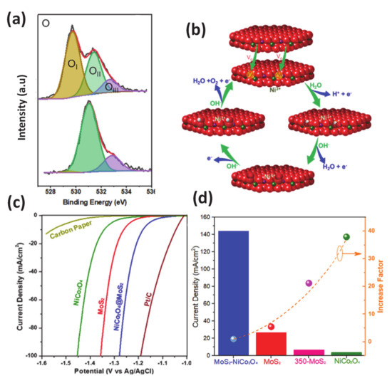 (a) XPS spectra of O 2s (b) The proposed OER cycles over the NiCo2O4@MoS2, where the formation of OH−, O2−, and OOH− intermediates are reconciled with oxygen vacancy-mediated Ni3+ center; the spinel structure with metal ions between interstices of two oxygen layers is used in this cartoon. HER performances of MoS2, NiCo2O4, and NiCo2O4@MoS2 samples: (c) Polarization curves in 1M NaOH at room temperature referred to Pt/C and carbon paper and (d) current density with an overpotential n = 0.3 V vs. RHE (column bars), and the current density increase factor calculated by comparing jNiCo2O4@MoS2/Jsample. Produced with permission [125]. Copyright 2019, American Chemical Society.