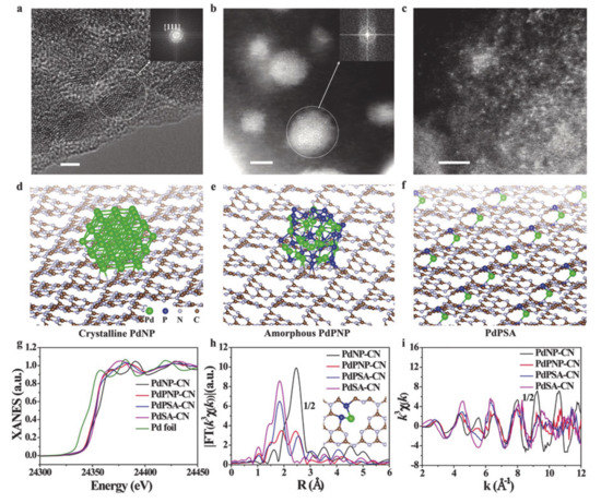 (a) High resolution transmission electron microscopy (HRTEM) image of PdNP-CN. High angle annular dark field scanning transmission electron microscope (HAADF-STEM) images of (b) PdPNP-CN and (c) PdPSA-CN. The geometry structures of (d) PdNP-CN, (e) PdPNP-CN, and (f) PdPSA-CN. (g) Pd K-edge X-ray absorption near edge structure (XANES) spectra and the corresponding k3-weighted Fourier transform (FT) spectra at (h) R and (i) k space. Scale bar: 2 nm. Reproduced with permission [133]. Copyright 2019, John Wiley and Sons.