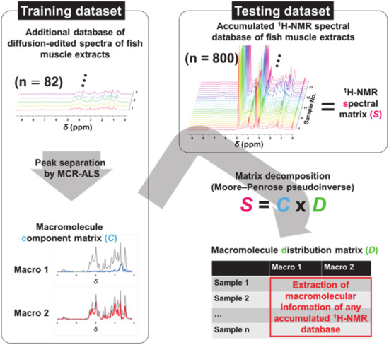 In this study, the two datasets shown in Figure 1 were used. One is the small-scale training dataset containing 82 diffusion-edited 1H-NMR spectra of fish muscle extracts. The NMR spectra of the small-scale dataset were digitized and peak separation was performed using multivariate curve resolution-alternating least squares (MCR–ALS) [10,11] to generate a macromolecular component matrix (Matrix C). The other dataset is the large-scale test data containing 800 conventional 1H-NMR spectra of fish muscle extracts (Matrix S). We assume that Matrix S is the product of matrix multiplication of Matrix C and another macromolecule distribution matrix (Matrix D). Therefore, the macromolecular signals could be extracted from the accumulated conventional 1H-NMR spectral data (Matrix S) based on the calculation of Matrix D.