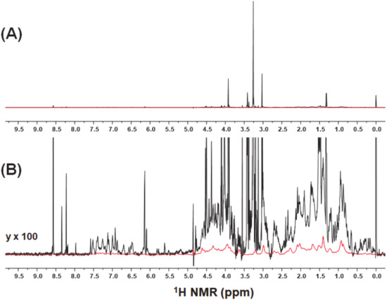(A) Entire view and (B) Y-axis expansion of 1H-NMR spectra of fish muscle extracts with (in red) and without (in black) a diffusion filter.