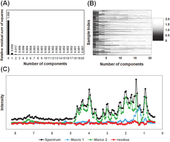 where X(i, j) is the spectral dataset of dimensions i samples by j NMR spectral buckets; A(i, k) and BT(k, j) are matrices which are related with the concentration profiles and pure spectra of the k components; E is the matrix of the residuals not explained by the chemical species in A and B. In the present study, i is 82 samples; j is 154 spectral buckets; k is determined by the modal residuals. Next, the pure spectral matrix BT corresponding to the selected k was used as the macromolecular component Matrix C in the decomposition of the large-scale 1H-NMR spectral dataset to assume the concentrations.