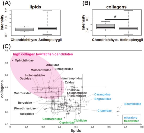 Macromolecular distribution in fish diversity: box plots of (A) lipids (p-value = 0.2156) and (B) collagens (p-value = 0.02159, * indicates a significant difference when p-value < 0.05) according to class, and (C) scatter plots according to family (mean ± standard error).