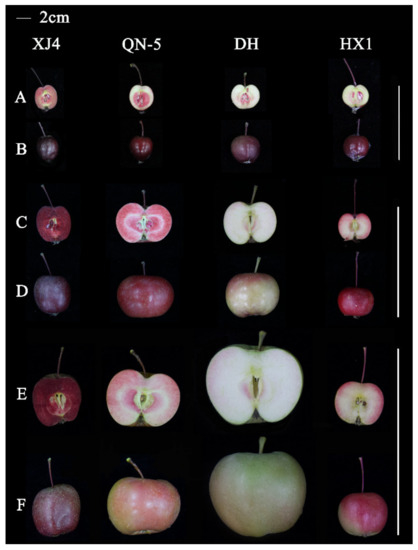 At young stage, the flesh color of ‘XJ4’ and ‘QN-5’ was red while only very light red flesh was observed in ‘DH’ and ‘HX1’ (Figure 1A). There was no obvious difference for peel color and fruit size among the four red-fleshed apple cultivars (Figure 1B). However, with the development of fruit, significant difference of both peel and flesh color, and fruit shape began to appear (Figure 1C,D). The darkest red color, nearly purple red, of peel and flesh was observed in ‘XJ4’, followed by ‘QN-5’. On the contrary, ‘DH’ had the lightest peel and flesh color. At the mature stage, ‘XJ4’ still had dark red peel and flesh, but the red peel and flesh of ‘QN-5’ was partially faded away, which might be caused by the increased fruit size (Figure 1E,F). The ‘DH’ showed the largest fruit size. The most significant difference was observed between ‘XJ4’ and ‘DH’ peel and flesh color, and fruit size at mature stage. According to the previous report, red-fleshed apple can be classified into two types [30,31]. The characteristics of type I red-fleshed apple is red pigment in fruit core and cortex, while type II red-fleshed apple has white core, only fruit cortex accumulate red pigments. Here, all of the four red-fleshed apple cultivars exhibited the characters of type I category.