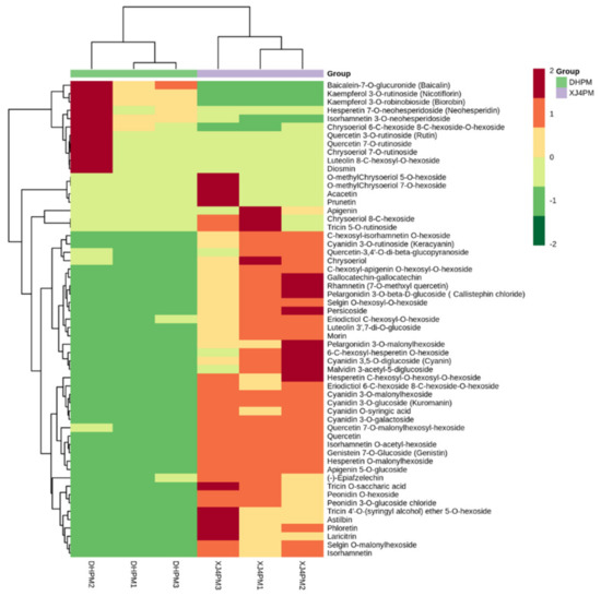 Heat map of significantly differential flavonoids metabolites in DHPM vs. XJ4PM. Red and green color indicates the content of significant differential metabolites, respectively. Columns and rows represent samples and individual metabolites, respectively. The depth of color indicates the value of correlation coefficient.