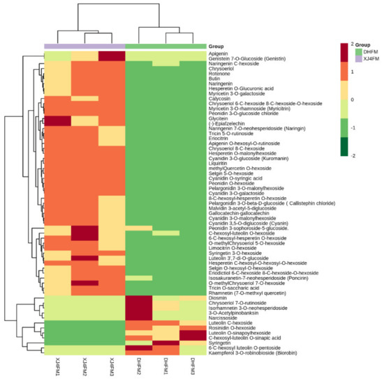 Heat map of significantly differential flavonoids metabolites in DHFM vs. XJ4FM. Red and green color indicates the content of significant differential metabolites, respectively. Columns and rows represent samples and individual metabolites, respectively. The depth of color indicates the value of correlation coefficient.
