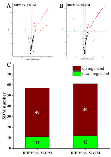 Volcano plot and number of upregulated and downregulated significantly differential flavonoids metabolites in four comparison groups. (A,B) Volcano plot of DHPM vs. XJ4PM and DHFM vs. XJ4FM. Green, red and black dots represents the number of significantly downregulated, upregulated and unchanged metabolites. (C,D) Number of significantly upregulated and downregulated metabolites (SDM) in two comparison groups DHPM vs. XJ4PM and DHFM vs. XJ4FM. SDM represents significantly differential metabolites.