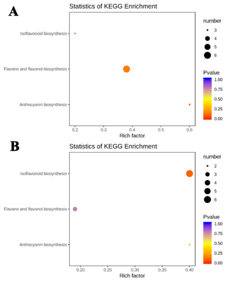 In order to better understand which categories the differential metabolites fell into, the metabolites were mapped to KEGG metabolic pathways. KEGG enrichment analysis suggested that the significantly differential metabolites were mainly involved in three biosynthesis pathways, namely isoflavonoid biosynthesis pathway, flavone and flavonol biosynthesis pathway, and anthocyanin biosynthesis pathway (Figure 6). The largest group of differential metabolites in DHPM vs. XJ4PM was in flavone and flavonol biosynthesis category, with the number of five (Figure 6A). The largest rich factor was found in anthocyanin biosynthesis pathway, which was 0.6 in DHPM vs. XJ4PM, followed by flavone and flavonol biosynthesis pathway. By contrast, in the DHFM vs. XJ4FM, the largest group of differential metabolites was in isoflavonoid biosynthesis pathway (Figure 6B). The rich factors of isoflavonoid biosynthesis pathway and anthocyanin biosynthesis pathway were both 0.4 with the greatest enrichment degree. Therefore, significantly differential metabolites in peel and flesh comparison groups were mainly distributed in isoflavonoid biosynthesis pathway and anthocyanin biosynthesis pathway.