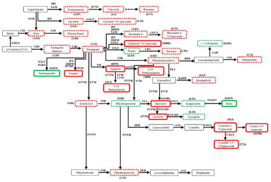 Profiles of differential metabolites in flavonoid biosynthetic pathways in DHFM vs. XJ4FM. The box in the pathway represents differential metabolites. Red and green represent upregulated and downregulated metabolites in content. Solid lines and dotted lines represent significant differences and insignificant differences, respectively.