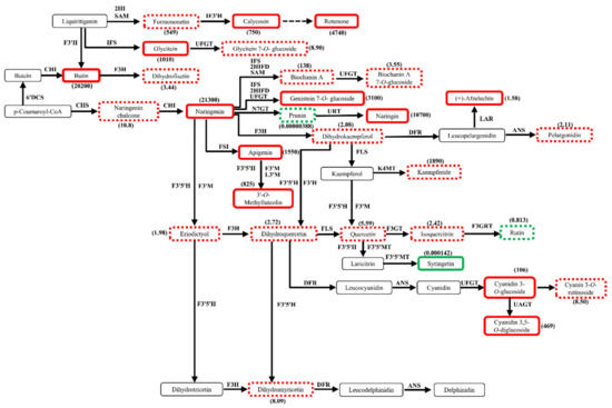 Profiles of differential metabolites in flavonoid biosynthesis pathways in DHPM vs. XJ4PM. The box in the pathway represents differential metabolites. Red and green represent upregulated and downregulated metabolites in content. Solid lines and dotted lines represent significant differences and insignificant differences, respectively.