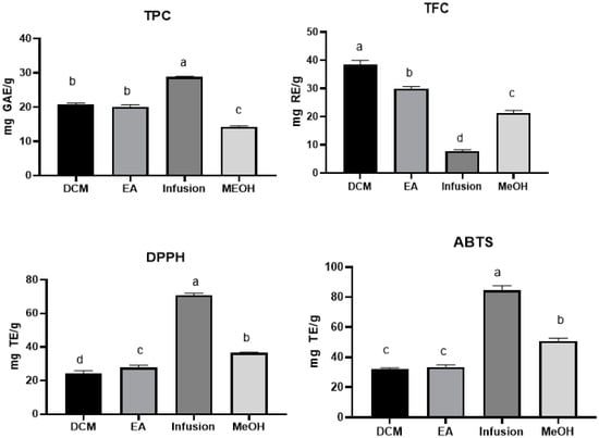 Plants are considered as a repository of molecules with biological properties that are useful for the modern drug discovery program. Among the known classes of bioactive compounds, polyphenols are well acknowledged for their potential as therapeutics [19,20,21]. Therefore, the present study evaluated the total phenolic content (TPC) and total flavonoid content of A. aspera extracts using spectrophotometric methods. Experimental data expressed as equivalents of gallic acid (GAEs), for TPC, and rutin (REs), for TFC, are summarized in Figure 1. The TPC varied from 14.28 ± 0.24 to 28.86 ± 0.12 mg GAE/g, with the highest content observed in the infused extract. The dichloromethane extract (38.48 ± 1.48 mg RE/g) followed by ethyl acetate (29.90 ± 0.71 mg RE/g) extract displayed the richest total flavonoid content.