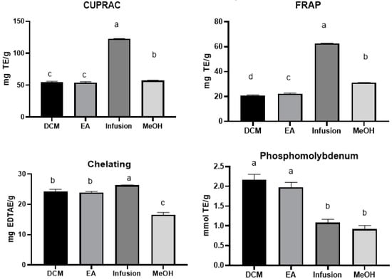 Reducing power (CUPRAC and FRAP), metal-chelating and phosphomolybdenum activities of the tested extracts. Values expressed are means ± S.D. of three parallel measurements. TE: Trolox equivalent; EDTAE: EDTA equivalent. Based on Tukey’s assay at p < 0.05, different letters (a, b, c and d) with in each bar indicated significant differences among the tested extracts (a: the highest value).