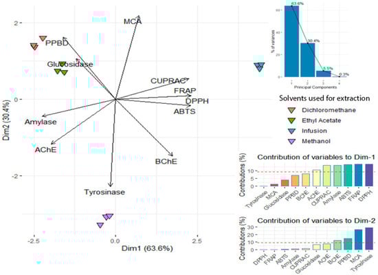 Thus, to assess the influence of solvent polarity on biological activities of A. aspera, a dataset was firstly submitted to the principal component analysis. Results depicted in Figure 3 elucidated that the two less polar solvents (dichloromethane and ethyl acetate), closed together, were distinguished from water and methanol along the first and second component of PCA respectively. The α-amylase inhibitory activity, both free radical scavenging and reducing power assays, characterizing PC1 (63.6% of total variance), allowed the separation of a water sample from dichloromethane and ethyl acetate extracts. However, tyrosinase, MCA, PPBD and BChE assays, associated with PC2 (30.4% of total variance), led to discriminate the methanol sample from dichloromethane and ethyl acetate samples. In light of the results, water extracts have the most significant antioxidant properties, suggesting that the polar compounds of A. aspera are responsible for such properties. Methanol was found to be more efficient in recovering specific compounds responsible for inhibition of tyrosinase, amylase and AChE enzymes, despite being inadequate for MCA activity. Besides, specific molecules involved in α-glucosidase inhibition and the total antioxidants were better extracted in DCM.