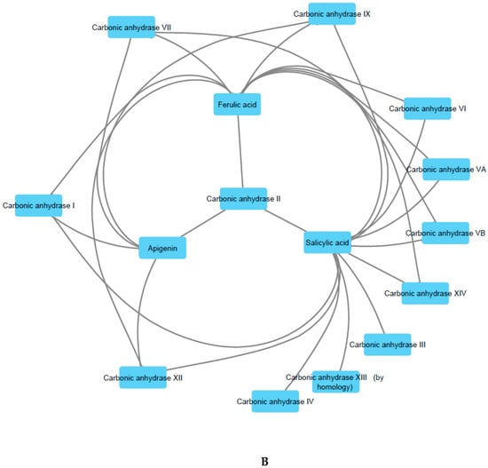 Interestingly, most of these compounds, namely apigenin, caffeic acid, ferulic acid, gentisic acid, isoquercitrin, kaempferol, salicylic acid and tiliroside showed moderate to high capacity to interact with several isoforms of carbonic anydrase (lyase family), among which it is noteworthy to highlight the type II isoform.