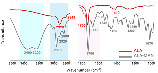 The attenuated total reflection Fourier transform infrared (ATR-FTIR) spectra for the covalent bonding of 2-aminoethyl 2,3,4,6-tetra-O-acetyl-α-d-mannopyranoside hydrochloride (MAN) molecules on lipoic acid (ALA) moieties.