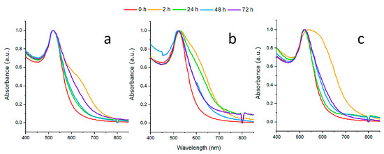Ultraviolet-visible spectra for: (a) Gold nanoparticles (AuNPs)-ALA, (b) AuNPs-MAN, and (c) hydrazinonicotinamide-glycine-glycine-cysteine (HYNIC)-AuNPs-MAN. The red color indicates the spectra of pristine gold nanoparticles and the yellow, green, blue, and purple colors indicate the incubation times at 2, 24, 48, and 72 h, respectively.