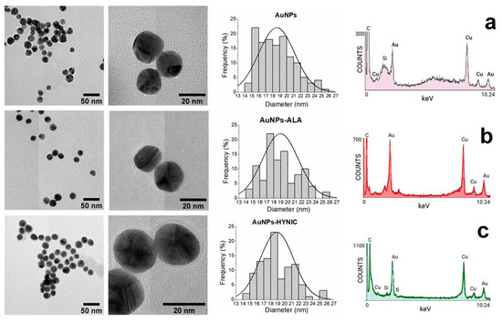 Figure 3 shows the transmission electron microscopy images and HRTEM analysis. It was observed that the conjugates were spherical and no evident changes in the average particle size occurred (see the histograms of the size distribution). The average size of pristine AuNPs was 18.57 ± 2.55 nm and the size after functionalization with ALA and HYNIC was 18.95 ± 2.54 and 18.87 ± 2.37, respectively; no statistical differences were observed. A halo of low electron density material was observed around the functionalized gold nanoparticle, which was related to the presence of an ALA or MAN coating. The HRTEM elemental analysis confirmed the metallic nature of nanoparticles, as well as the presence of N and S elements in the organic molecules related to ALA and MAN.
