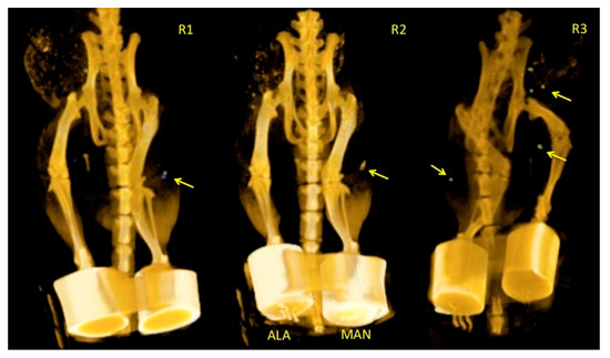 Micro single-photon emission computed tomography (SPECT)/computed tomography (CT) images depicting AuNPs-MAN48h vs. AuNPs-ALA48h accumulation in the popliteal lymph node. Arrows indicate the location of the nodes. ALA and MAN notation indicates the injection of AuNPs-ALA48h and AuNPs-MAN48h in the left and right footpad, respectively. Animals were oriented in a prone position.