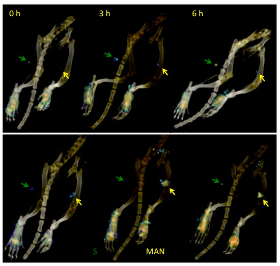 MicroSPECT/CT images of two different rats at different times, illustrating the differences in the lymphatic mapping of 99mTc-Sulfur colloid (S) and 99mTc-AuNPs-MAN48h (MAN). Arrows indicate the location of the lymph nodes. Animals were oriented in a prone position.