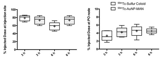A box and whisker plot showing the results of the percentage of injected dose at the injection site (left) and popliteal node (right) at 3 and 6 h after the injection of either 99mTc-Sulfur colloid or 99mTc-AuNPs-MAN48h. Boxes extend from 1st to 3rd quartiles; thick lines and + symbols inside boxes represent the median and mean (n = 5), respectively; whiskers go from the smallest to the largest values in each group and there were no outliers. No statistical difference was observed after ANOVA.