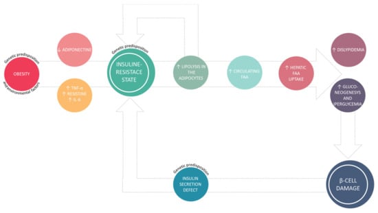- Environmental influencesNew understandings of the progression of T2DM are related both to the lifestyle and to the gut microbiota and the dynamics that leads to microbiome dysbiosis [24]. This change in the microbiota composition is able to reshape intestinal barrier functions and to induce metabolomic and signaling pathways related to the insulin resistance.