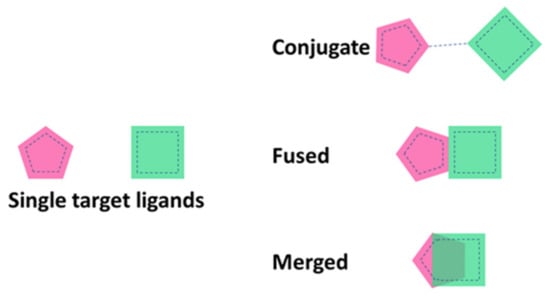 The knowledge-based approach also known as “framework combination” relies upon structure–activity relationship (SAR) knowledge of every single target involved, in which the pharmacophores are combined in different ways (as represented in Figure 3), where they can be connected by a linker, or they can be overlapping in the same compound or highly integrated in a multi-target drug [31].