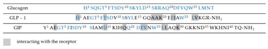 The design for a dual drug clearly focuses on compounds capable of activating both the predominant endogenous incretins, GLP-1 and GIP. Furthermore, the absence of adverse cardiovascular side effects or neuropsychological complications increases the interest in incretin-based drugs. The design process starts from the observation that GLP-1 and GIP share a high degree of sequence similarity, as shown in Figure 4, which can be modified in order to obtain potent and balanced co-agonism. More specifically this was achieved with the substitution of residues Glu3 and Lys16 of GIP sequence with the obtained peptides having almost no in vitro glucagon activity. Furthermore, the modifications could include substitution with Lys40 that allows site-specific lipidation or PEGylation of the peptide in order to avoid DPP-4 inactivation and consequently to permit less frequent administrations [45].