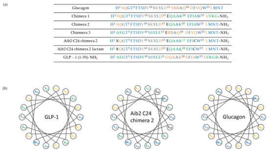 Structure of glucagon, GLP-1 and chimeric peptides. (a) Amino acid sequence and structure of glucagon and GLP-1 chimera. Underlined residues indicate site of lactam formation. (b) Helical wheel representation of glucagon, GLP-1 and chimeric peptide showing residues 12–29.