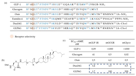 Based on the above findings, investigation of compounds simultaneously targeting the GLP-1R and glucagon receptor (GcgR) have been carried out. The research groups of Day et al. [51] and Pocai et al. [52] have first reported peptides that act as such dual drugs and some representative peptides are shown in Figure 5. In preclinical studies, they showed that the treatment with these co-agonists induces superior weight loss and lipid lowering, without causing hyperglycemia or any other adverse effects in diet-induced obese (DIO) mice.