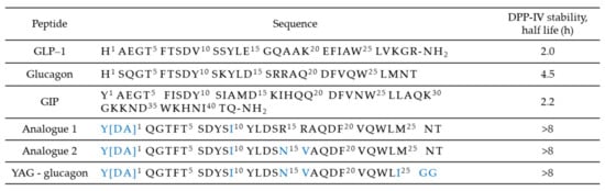 All three of these gastrointestinal hormones share similar N-terminal sequences, simplifying the design of single-sequence multi-receptors agonists. A key factor that has to be considered is the relative potency of the compound towards each receptor. Triagonists can be designed in order to achieve a balanced agonism or with an agonism ratio that favors one receptor over the others in function of the desired effects. For example, YAG-glucagon, a glucagon-derived triagonist [57], has reported to have no effect on body weight while significantly improved glycaemia in high fat fed mice due to unbalanced agonism and submaximal potency. The two analogues, namely analogue 1 and analogue 2, shown in Figure 7, were also designed by modification of the amino acid sequence of human glucagon by substituting key amino acids with those that are known to be important in the biological function of GIP, as shown in Figure 4. Balanced triagonists were investigated as well, and recently MAR423, developed by Novo Nordisk, entered initial Phase I testing.