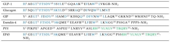 Amino acid sequences of glucagon-like peptide 1 (GLP-1), glucagon, and of glucose-dependent insulinotropic polypeptide (GIP).