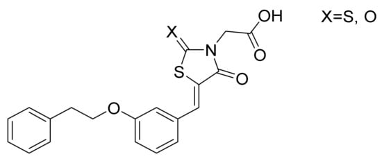 - Maccari, R.; Del Corso, A.; Paoli, P.; Adornato, I.; Lori, G.; Balestri, F.; Cappiello, M.; Naß, A.; Wolber, G.; Ottanà, R. An investigation on 4-thiazolidinone derivatives as dual inhibitors of aldose reductase and protein tyrosine phosphatase 1B, in the search for potential agents for the treatment of type 2 diabetes mellitus and its complications. Bioorg. Med. Chem. Lett. 2018, 28, 3712–3720. [Google Scholar] [CrossRef]
