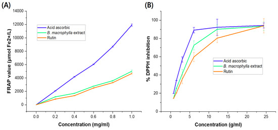 The antioxidant capacity of B. macrophylla extract determined by the FRAP assay is presented in Figure 2A. As shown by the FRAP value, the plant extract showed strong antioxidant potential, which was 3.01 times lower than that of the standard ascorbic acid and higher than that of rutin (p < 0.01) at same concentration of 1 mg/mL. As shown in Figure 2B, the ethanol extract exhibited significant free-radical scavenging activity, as determined by the DPPH assay. The antioxidant effect of this extract was comparable to those of ascorbic acid and rutin, used as reference compounds. The IC50 value of the B. macrophylla extract (3.94 ± 0.21 µg/mL) was 1.38-fold lower than that of ascorbic acid (2.86 ± 0.11 µg/mL) but 1.24-fold higher than that of rutin (4.90 ± 0.12 µg/mL).