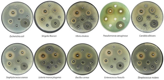 A total of 10 pathogenic bacterial strains were supplied by Ho Chi Minh City University of Science, including Escherichia coli ATCC 11775, Shigella flexneri ATCC 12022, Vibrio cholera ATCC 17802, Pseudomonas aeruginosa ATCC 9027, Staphylococcus aureus ATCC 6538, Listeria monocytogenes ATCC 15313, Bacillus cereus ATCC 11778, Enterococcus faecalis ATCC 29212, Streptococcus mutans ATCC 25175, and Candida albicans ATCC 90028. The bacteria were grown overnight at 37 °C in Luria Bertani broth (Merck). The strains were grown in liquid medium to an optical density (OD600nm) of ~0.8–1.0 (corresponding to approximately 1 × 108 colony-forming unit (CFU)/mL. ascertained by plate counts on nutrition agar). Antibacterial screening was performed by the agar well diffusion method, as previously described [19]. Briefly, a 0.1 mL suspension of each microorganism containing around 1 × 108 CFU/mL was spread evenly over Mueller–Hinton Agar (BD-Difco). Wells of 6 mm in diameter were punched in the culture media with a sterile cork borer, as previously described [20]. Then, 100 µL of the aliquots ranging from 0.01 to 500 mg/mL was dropped into each well to fullness. The treated dish was incubated at 37 °C for 24 h. The antimicrobial activity was evaluated by determining the diameter of the inhibition zone. Ciprofloxacin (500 µg/mL) and 5% DMSO in distilled water were used as positive and negative reaction controls, respectively.