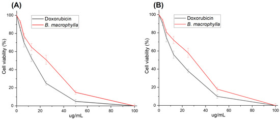 Cell survival curves of HeLa (A) and HCT116 (B) cell lines treated for 48 h with Doxorubicin and the B. macrophylla ethanol extract at difference concentrations. Data are shown as mean ± SD of three independent experiments (* p < 0.05; the mean difference is significant at the 0.05 level compared to the control by one-way ANOVA).