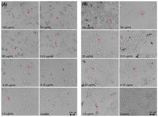 Morphological changes of (A) HeLa and (B) HCT116 cells treated with the B. macrophylla ethanol extract at difference concentrations for 48 h. Morphological changes corresponding to cell shrinkage re indicated by red arrows.