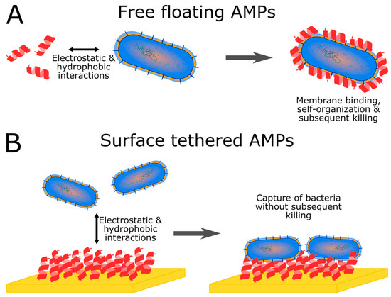 Tethering AMPs can prevent the triggering of killing mechanisms of the bacteria. (A) Free floating peptides can self-organize onto the bacterial membrane and subsequently disrupt it or insert themselves inside the cell in order to kill it. (B) Tethered peptides can no longer self-organize at the surface of the bacterial membrane, thus inhibiting their bactericidal activity. Interaction abilities can, however, still be conserved, thus allowing the design of capture surfaces for biosensing purposes.