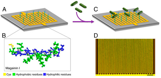 AMP-based device for the electrical detection of bacterial pathogens. (A) Schematic of the interdigitated microelectrode array, with immobilized AMPs. (B) Representation of the magainin I in helical form, with the added terminal cysteine residue, allowing its anchoring on gold. Hydrophobic and hydrophilic residues are highlighted to emphasize the amphiphilic nature of magainin I. (C) Binding of bacterial cells on the array, thus enabling the detection. (D) Optical image of the interdigitated microelectrode array (scale bar: 50 µm). Reproduced from [31].