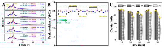 (A) The XRD curves of the bamboo slices after 180 °C saturated steam heat treatment. The corresponding diffraction peak location of cellulose (002) plane (B), and relative crystallinities (C) of bamboo slices with different initial moisture contents and heat treatment times.