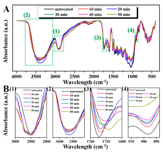 Complete (A) and partial (B) FTIR curves of the bamboo slices with 25% initial moisture content treated by saturated steam heat at 180 °C with different times.